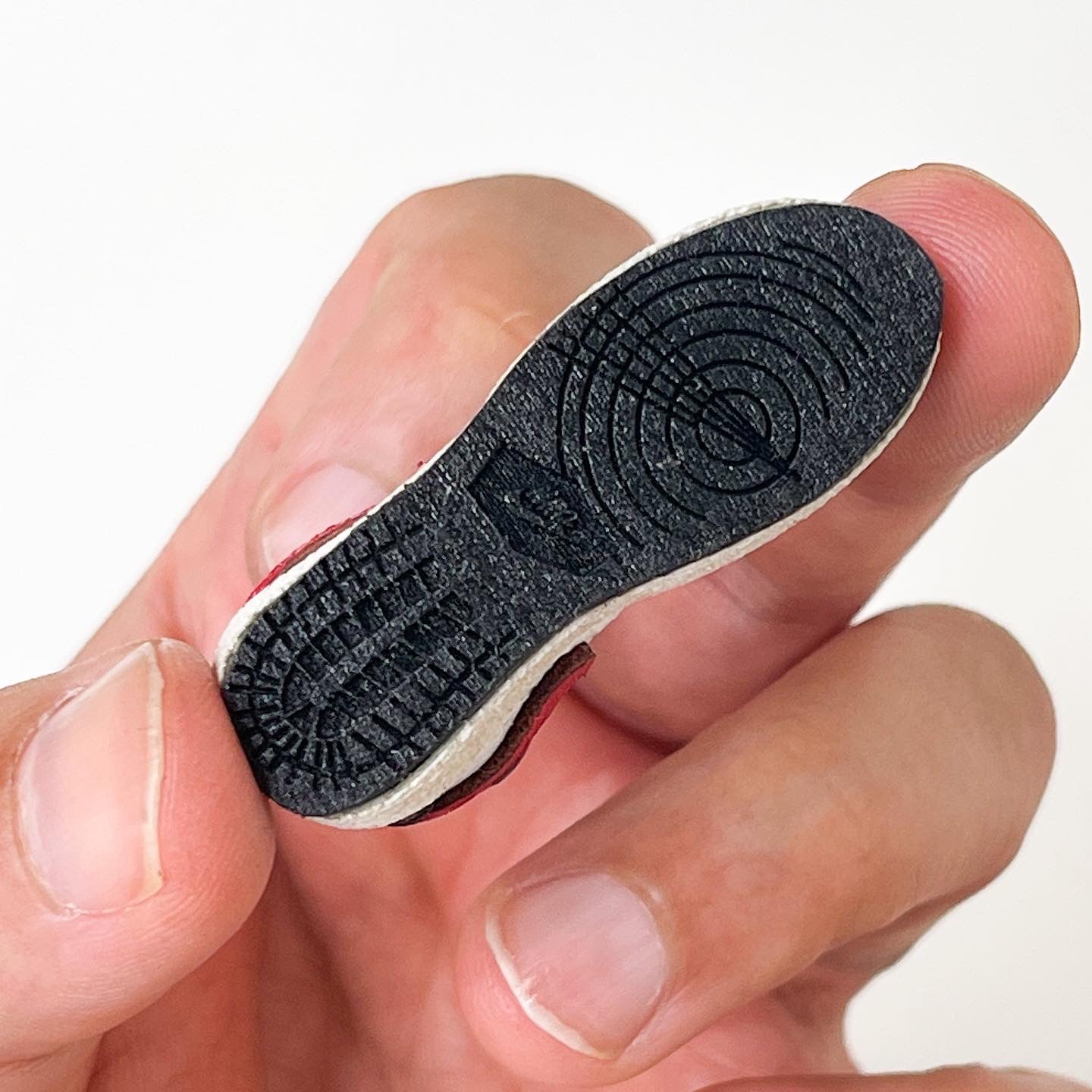 Collectible miniature sneaker inspired by Air Jordan 1 for doll or display. Each handmade Haute Hero miniature is a artistic replica reduced in size at a scale of 1:6 and made in limited qualities. True to the original pieces in structure and materials, each miniatures is precision-crafted, making them a perfect fit for doll collectors, sneaker lovers and design professional. Tweezers not included.